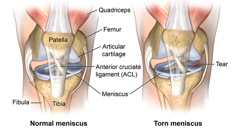 The meniscus is a piece of cartilage that acts as a shock absorber between your femur and tibia. A meniscus tear can occur due to a sudden twist or turn, often during sports activities. Symptoms include: