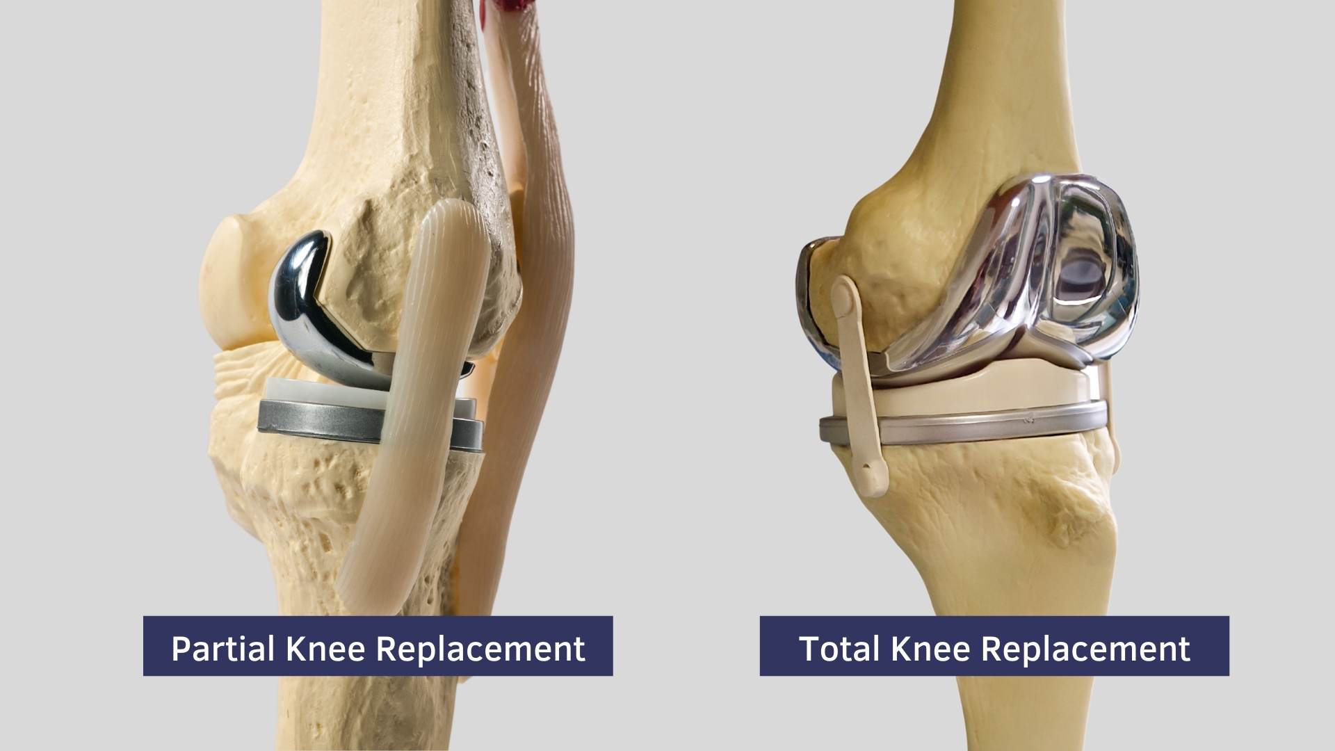 There are two types of knee replacement surgeries: total knee replacement and partial knee replacement. In total knee replacement surgery, both sides of the knee joint are replaced, while in partial knee replacement surgery, only one side of the knee joint is replaced.
